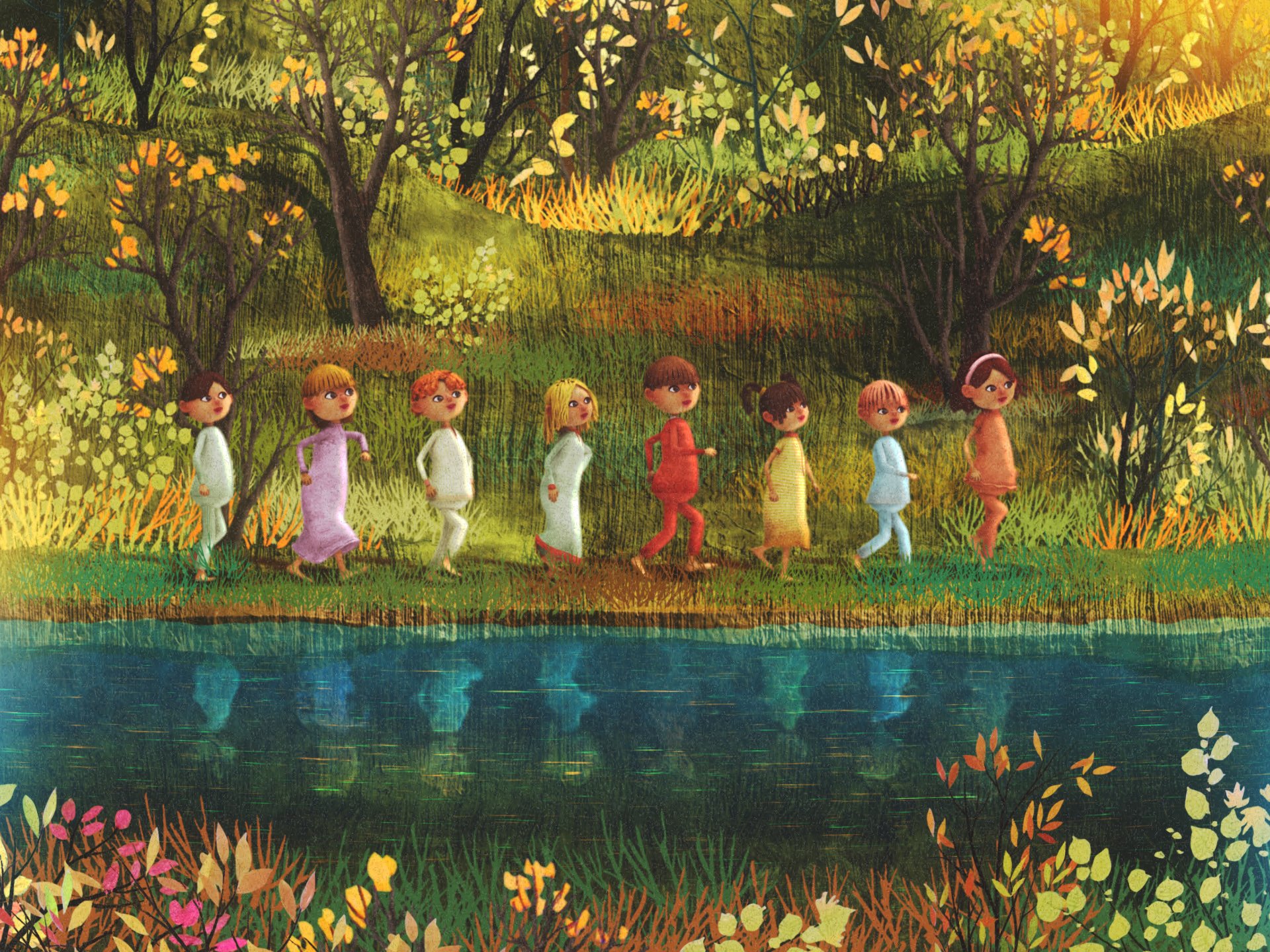 In the idyllic Small Village live happy and lively children. At night before bed, they carelessly take off their slippers and throw them around the room. To their great surprise, the footwear disappears by morning. At first, they search the house unsuccessfully, then their parents tell them that the cat took them. They can only run outside when it is warm enough so that their bare feet don't get cold. When they finally gather, they decide to find Muca Copatarica and ask her for their slippers. They set off into the forest. Muca Copatarica welcomes them kindly and gives them their mended and cleaned slippers, and the children promise her that they will take better care of them from now on.